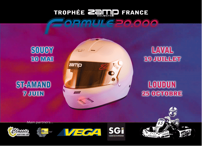 Le règlement reste majoritairement inchangé et la Formule 20.000 continuera à accueillir les karts de 1986 à 2002. Il en reste sûrement encore beaucoup qui attendent dans les remises de revoir la lumière du jour ! Le Vega XH4 sera toujours notre pneu slick avec une dotation offerte par le manufacturier. Nos autres partenaires principaux sont SGI, qui récompensera le vainqueur de la préfinale, ainsi que Classic kart Store, dont le site hébergera les infos de la catégorie, et Objectif Sticker. En attendant la rentrée des très hauts régimes, bon nombre de pilotes attendus sur les épreuves du Trophée Zamp Helmets France répèteront ce week-end leurs gammes de vrombissement à Salbris, à l’occasion, des Rencontres Intergénérationnelles de la Formule 20.000 et du survirage charismatique.