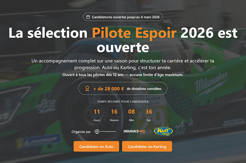 L’opération Pilote Espoir revient pour sa session 2026. Ouverte à tous les pilotes de karting et d’automobile âgés de plus de 12 ans, cette initiative a pour vocation de révéler et d’accompagner les talents de demain.