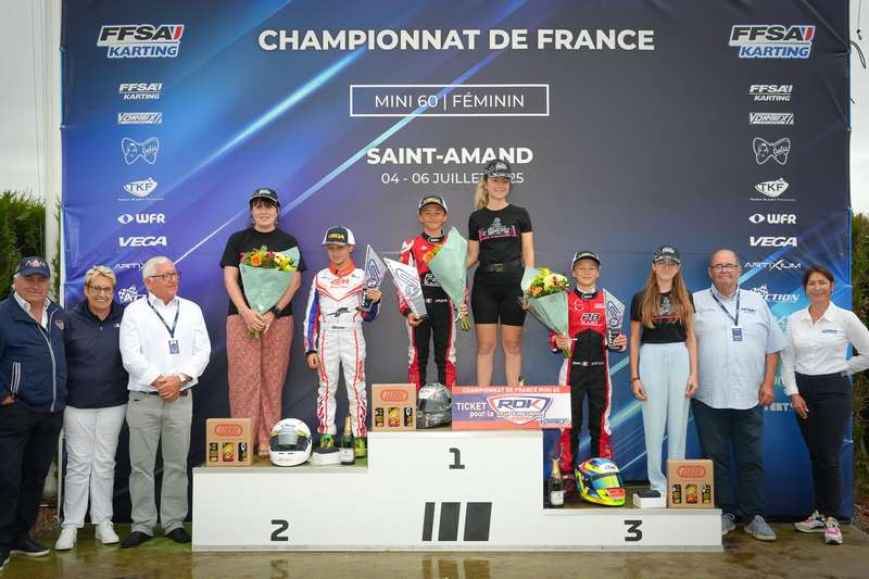 Luna Cléret (Pantano/IAME) a dominé nettement le Championnat de France Féminin de Saint-Amand. Après sa pole position en qualification, elle a remporté les trois manches qualificatives ainsi que la Super Manche. Malheureusement, elle a été victime d’un problème de démarreur en finale. Obligée de faire appel à un lanceur externe, elle a dû partir en dernière position. Sa plus sérieuse adversaire, Tania Cirelli (CRG/IAME), par ailleurs pilote spécialisée dans la catégorie KZ2, a saisi l’opportunité de gagner la dernière course avec une confortable avance et de remporter le titre. La Belge Maerle Taylor (Kosmic/IAME) terminait en 2e position devant Mathilde Habrant (KR/IAME). La jeune Léonie Her (RK/Rotax), qui brille par ailleurs en Championnat de France Junior, se classait 4e devant Luna Cléret, remontée de près de 30 places avec le meilleur tour en course. Lynis Chollet (Redspeed/IAME), + 5 places, occupait la 6e position devant Alessia Cirelli (CRG/IAME) et Zoé Lebourdais-Petit (EOS/Rotax). Lola Gervais (Sodi/Rotax) et Noémie Pradier (CRG/Rotax) complétaient le top 10.